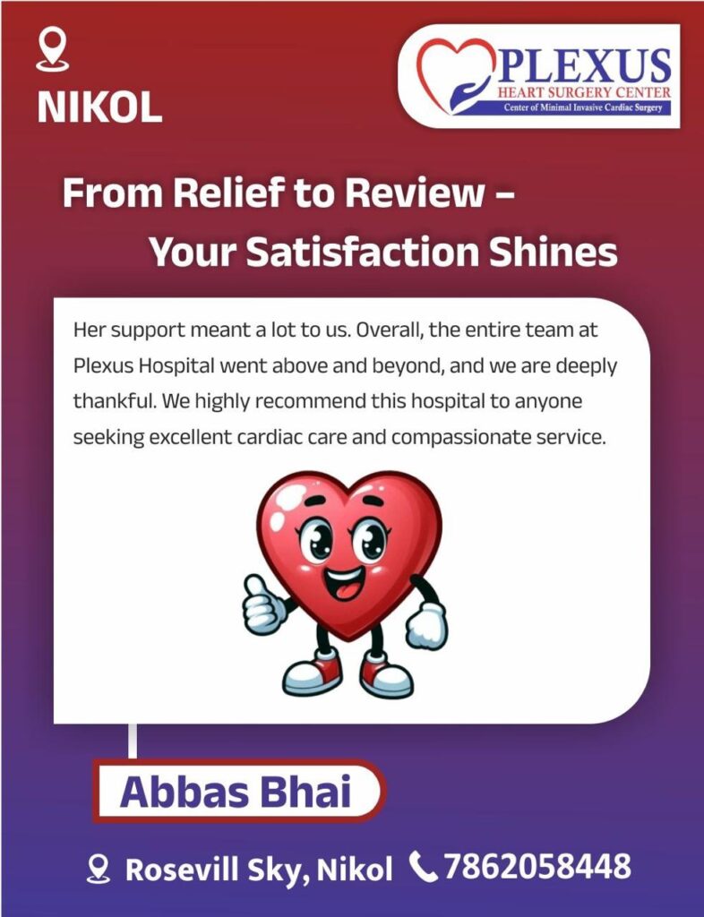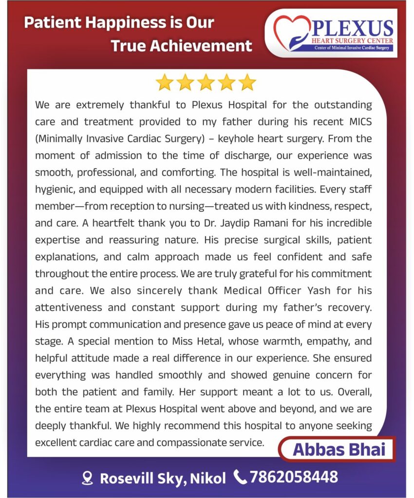 Posted on Vishnubhai PatelTrustindex verifies that the original source of the review is Google. only heart surgeryPosted on Ajudiya RaviTrustindex verifies that the original source of the review is Google. Excellent doctor work and your staff Good food for patient Good care of patient Clean and very impressive all staff and hospital alsoPosted on OM PRAKASHTrustindex verifies that the original source of the review is Google. Plexus Hospital provided exceptional care during a successful heart surgery for my loved one. The skilled surgeons, advanced facilities, and compassionate staff ensured a smooth procedure and recovery. Highly recommended for top-notch medical care...! Thank you Dr jaydeep sir All staff Thanks againPosted on Parvej MemanTrustindex verifies that the original source of the review is Google. That's wonderful to hear! When hospital staff are friendly and provide excellent care, it can make a huge difference in a patient's experience, especially during challenging times.Posted on Sanjay JataparaTrustindex verifies that the original source of the review is Google. Jaydeep ramani sir best cardiologist in gujrat .and special kiy hol surgery was best option to surgery